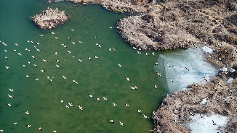 候鸟在黄河宁夏段一处湿地栖息◈★◈、觅食(2025年2月26日摄◈★◈,无人机照片)◈★◈。新华社记者 王鹏 摄